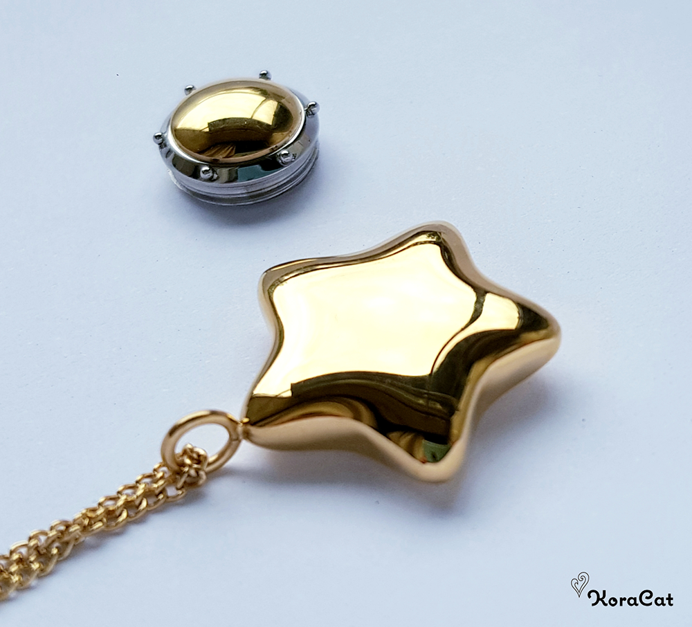 Each Star Locket pendant opens with a round screw lid, and comes with a gold stainless steel chain. There is a removable moon and red gem charm inside, attached to the locket centre with magnets. You could also fill this locket with other small charms, ashes, hair or special objects.