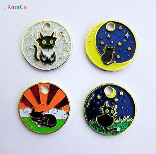This beautiful set of 4 tags features Kora Cat with gold plating and various combinations of special translucent, glitter and glow enamels. :3