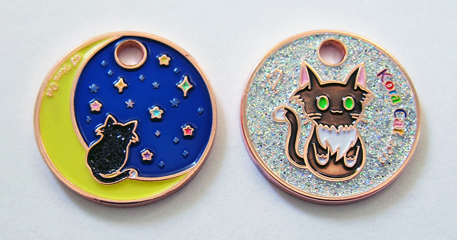 This beautiful set of 2 tags features Kora Cat with copper plating and various combinations of special translucent, glitter and glow enamels. :3
